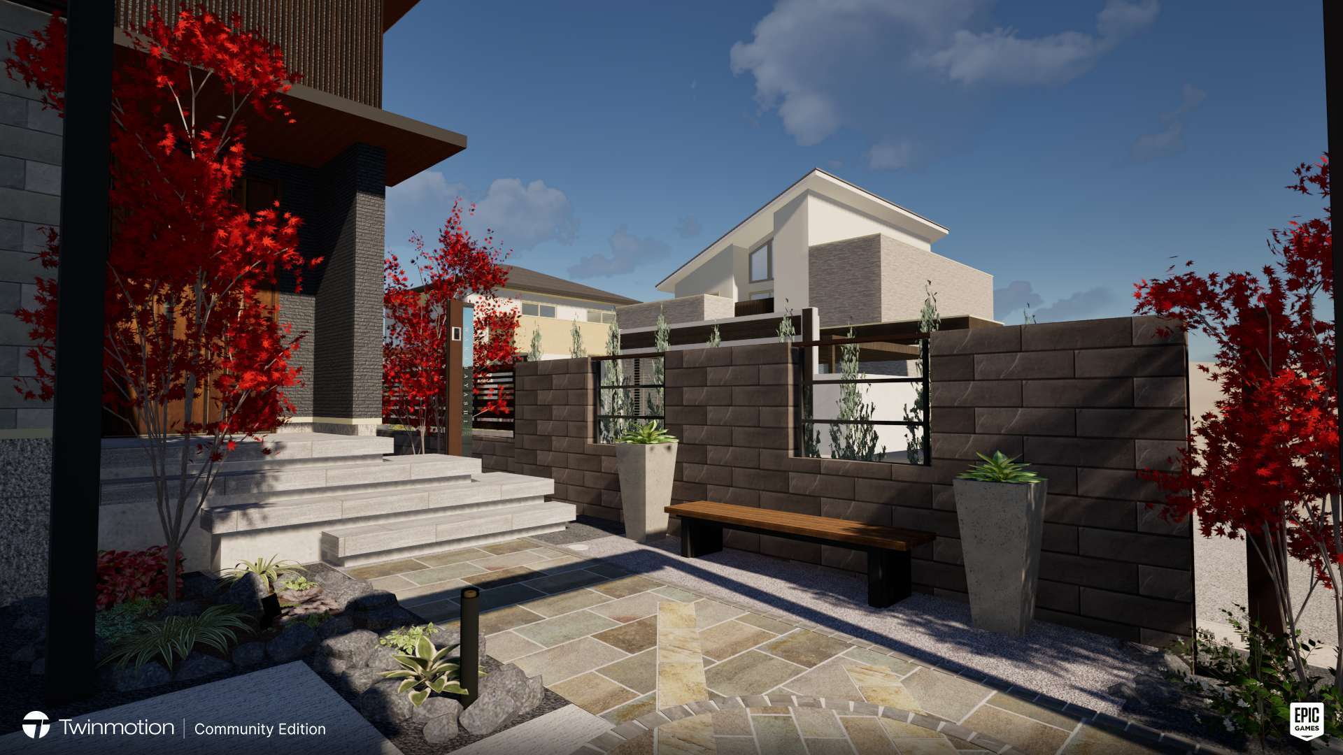 弊社では3Dイメージパース図でエクステリアプランをご提案しております。EpicGamesのソフトを使用しており、よりリアルな3Dイメージ図で完成図をご覧いただきイメージを共有致します。