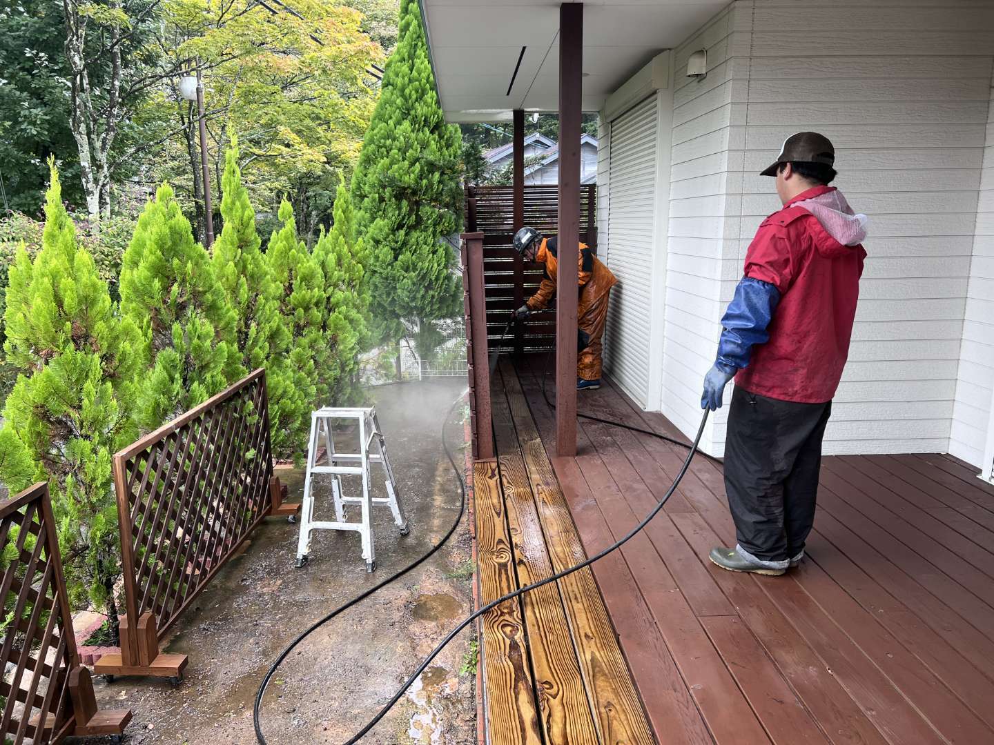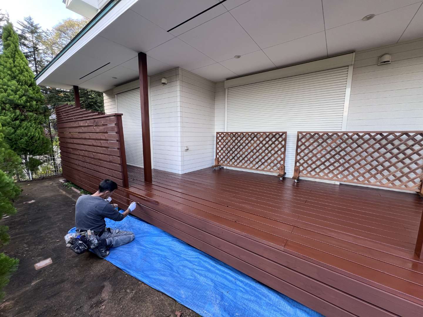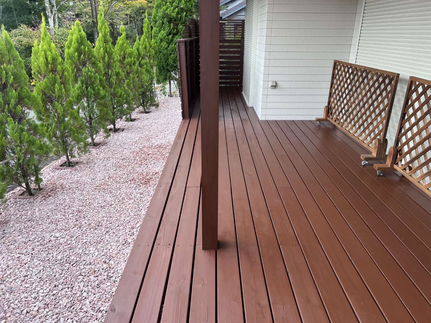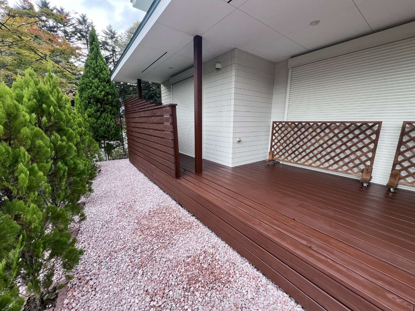 戸建て リフォーム ウッドデッキ 軽井沢 軽井沢町 ウッドデッキ塗装 軽井沢町にて、天然木デッキの補修と塗装を行いました。お客様の大切な空間を、新たな魅力で包み込むお手伝いができ嬉しく思います。また、ここのお庭の床面は軽井沢ならではの凍上現象によってかなり状態が悪くなっていましたが、防草シートと化粧砂利ですっきりとした仕上がりになりました。 場所 長野県軽井沢町 1 / 1 前の施工事例 戸建て 佐久穂町 人工木デッキとテラス屋根 次の施工事例 戸建て 佐久市 人工木デッキ改修工事